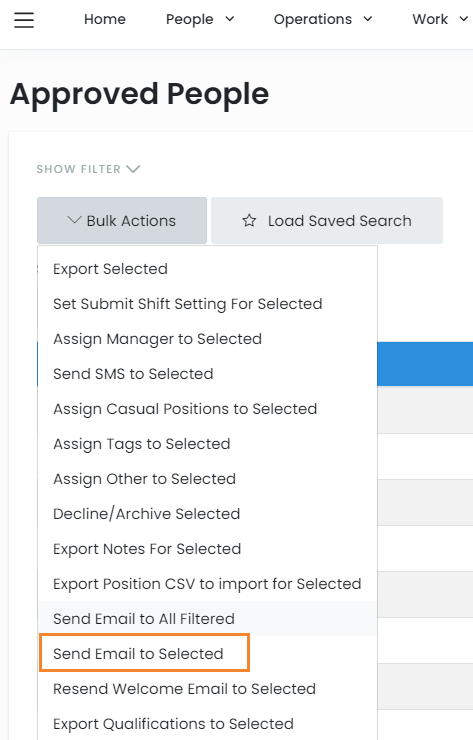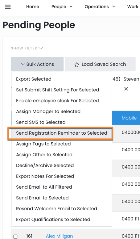 - Send a bulk registration email to pending candidates via Pending People > Bulk Actions.