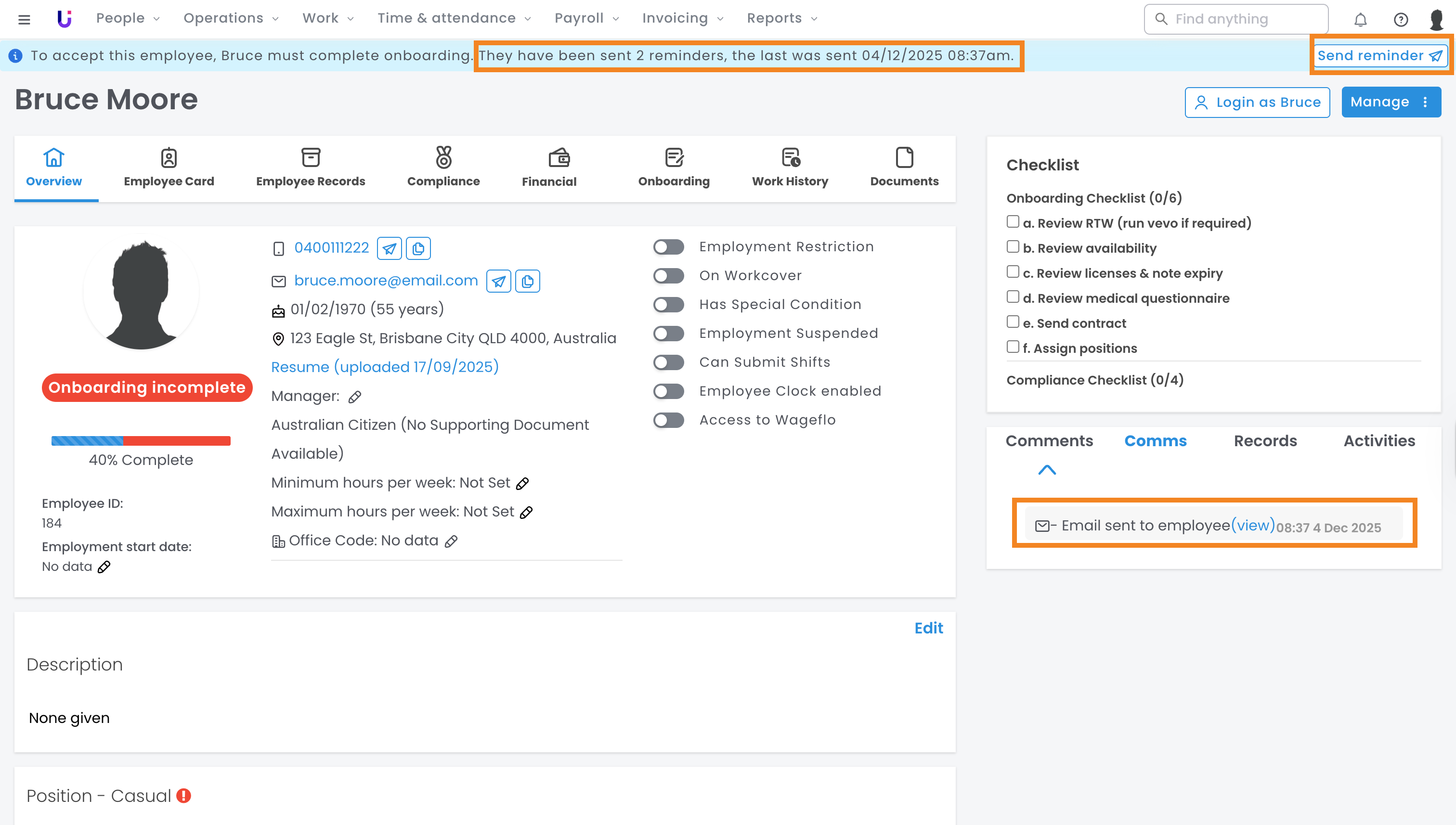 - Communicate with employees and be able to see a record of the comms you have sent them.