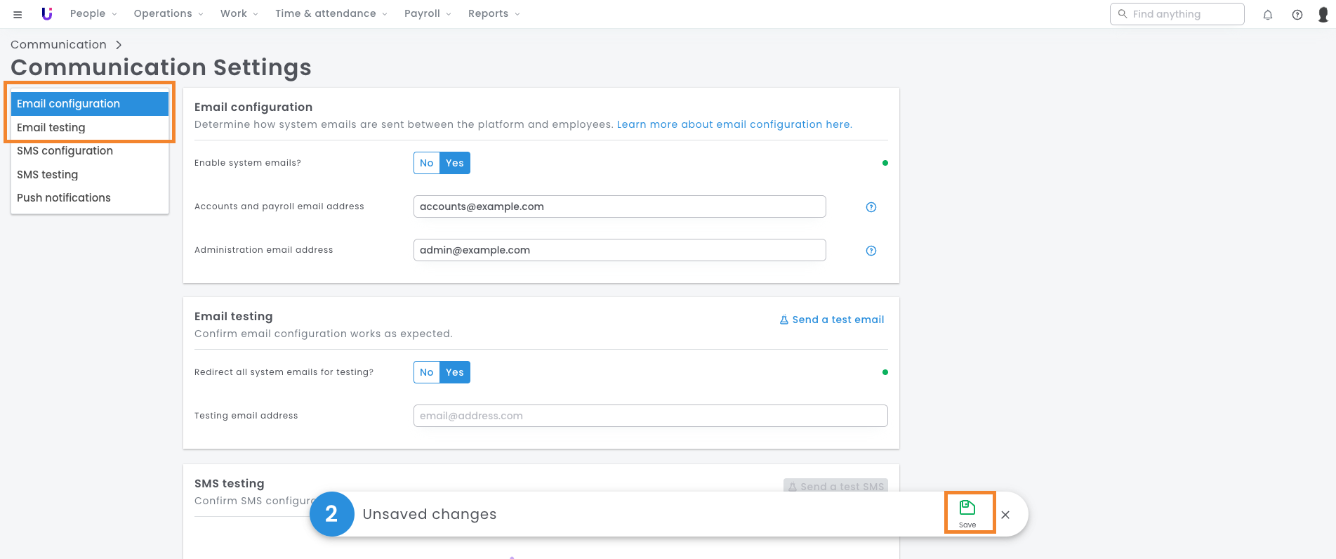 - Configure your 'Email Settings' or 'Email Testing' settings as needed. A floating bar will appear on the button with the number of changes you've made.