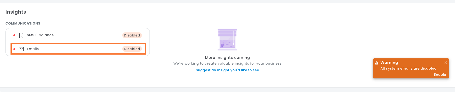 Hot tip: If your email settings are turned off, you can also check your email status from your Dashboard > Insights. Additionally, you will see the warning below on your platform.
