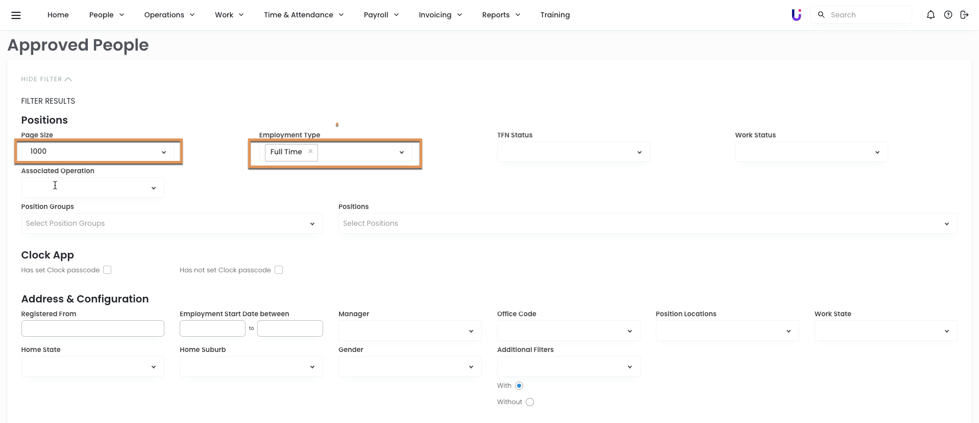 In the below example, we have selected to filter to our full-time employees only. By increasing the page size to a maximum of 1000 we ensure that all of our employees will appear on one page.