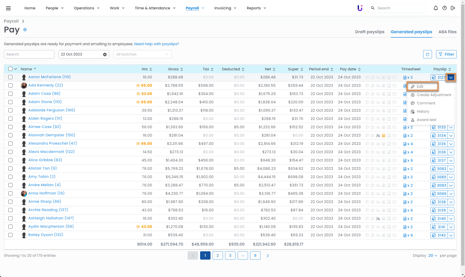 - Find the relevant payslip via Payroll > Pay > Generated payslips and select down arrow > Edit to edit the payslip. This can also be actioned to a draft payslip.