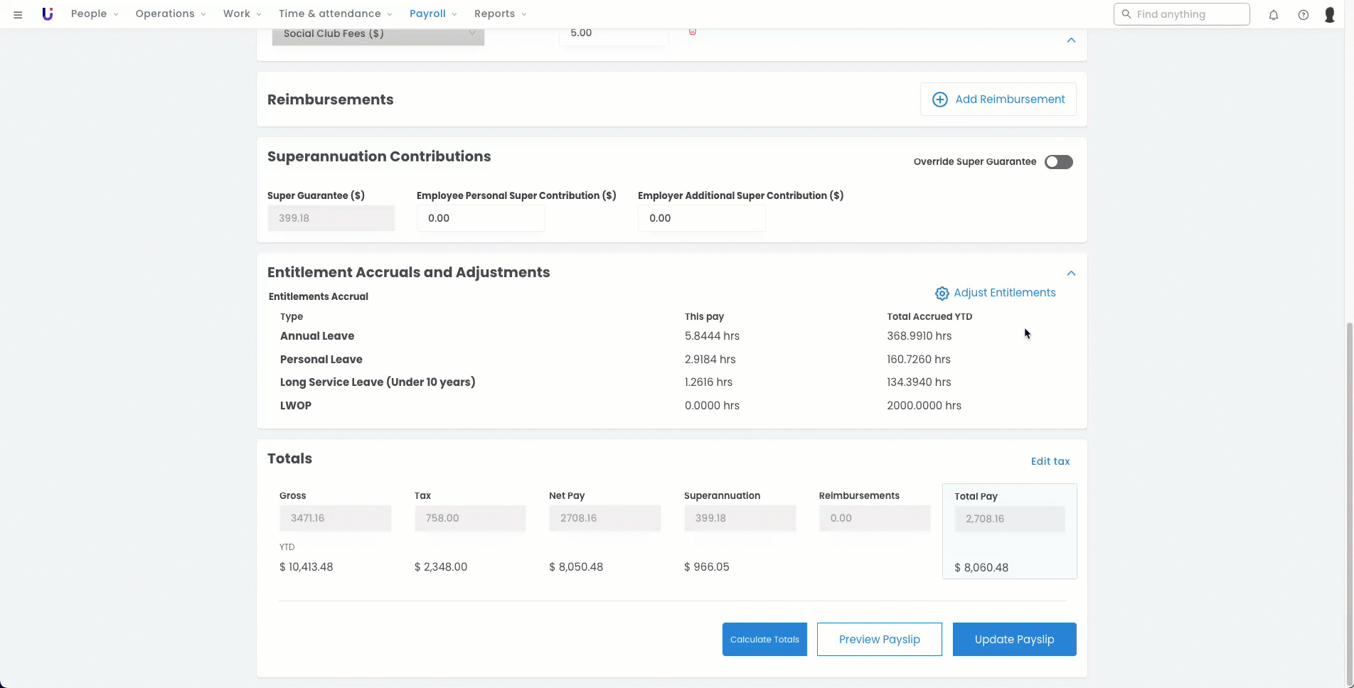 Please note: Do not select Calculate Totals as this will revert your entered tax amount. Instead, select Preview Payslip to make sure the amounts are correct. - Then select Update Payslip and add a comment to capture why you edited the payslip.
