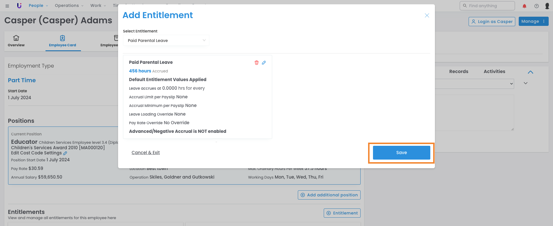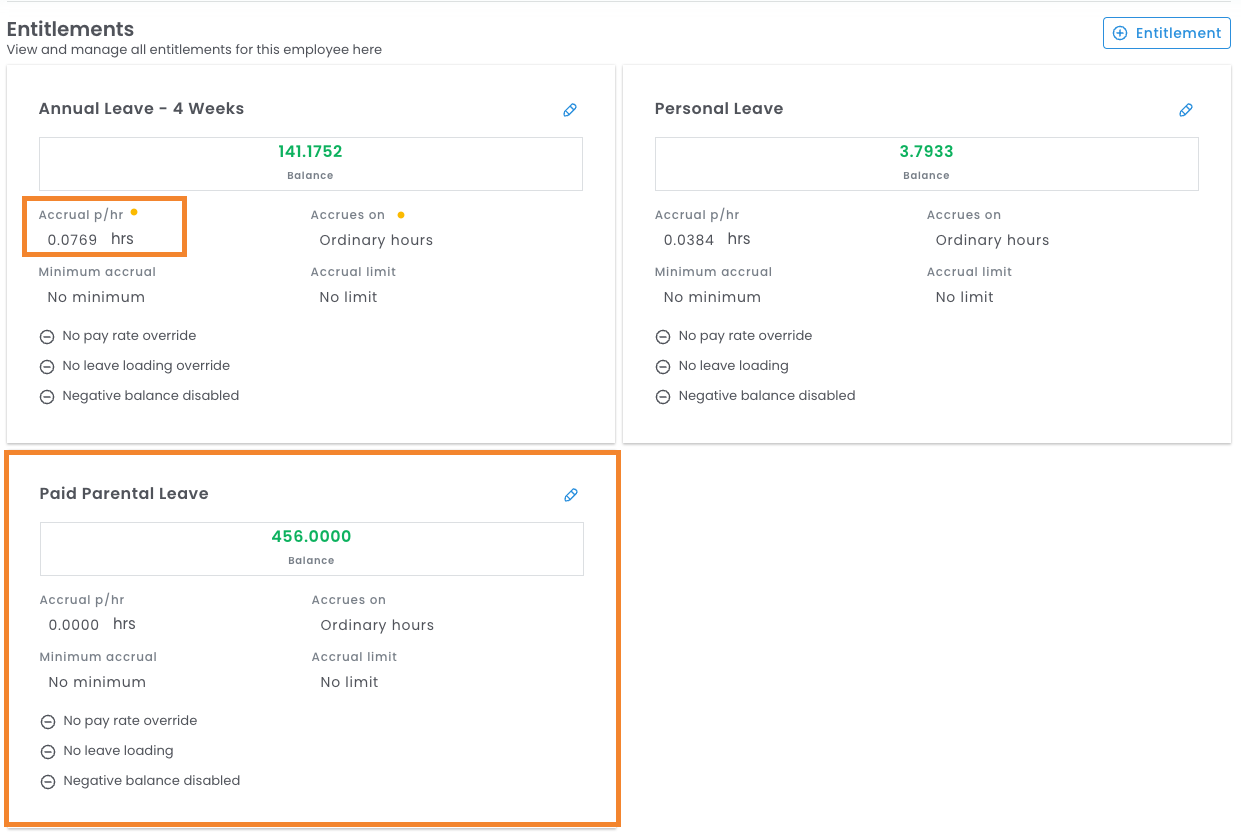 - Adding the entitlement to the employee with the relevant employment type. (e.g. Adding Parental Leave to an eligible employee).