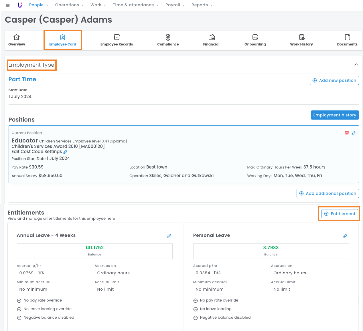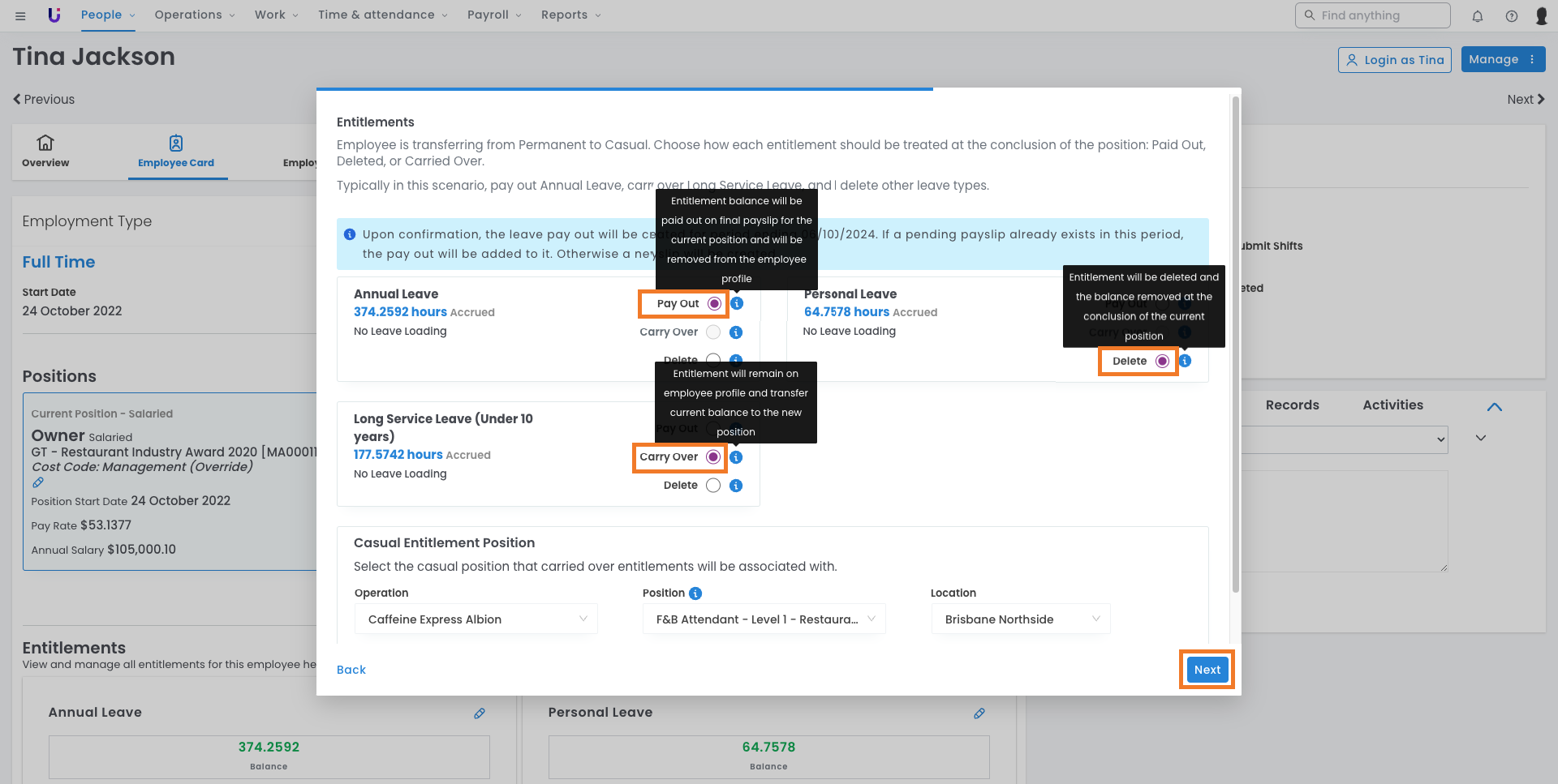 - Managing entitlements when employees change employment types, e.g. full-time to casual