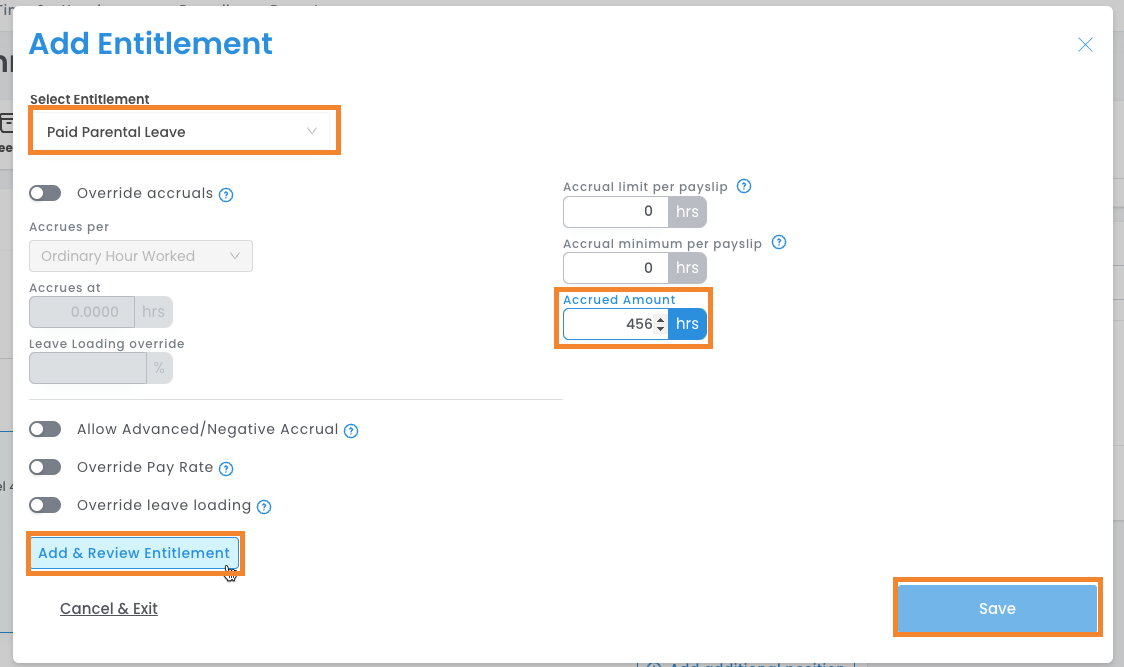 Select 'Add & Review Entitlement', then add any additional leave entitlements. Once all leave types have been added, select Save.