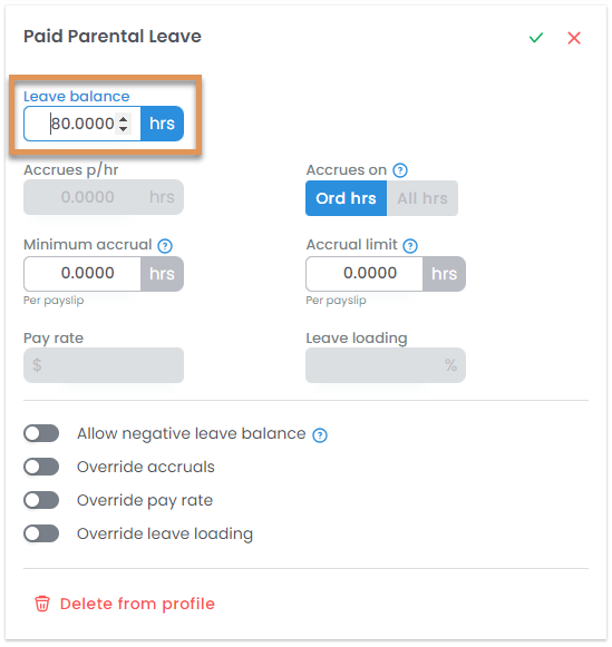 - Accrual minimum per payslip - Sets the minimum hours a leave type can accrue per payslip.