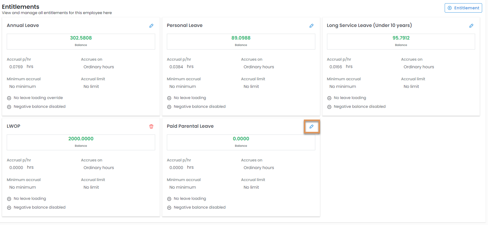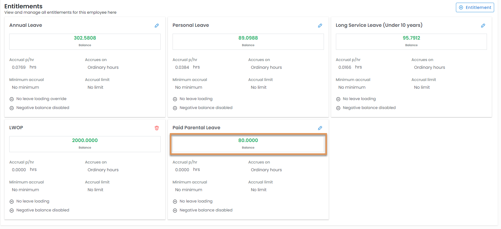The newly added entitlement will now display with the employees existing entitlements ready for use.