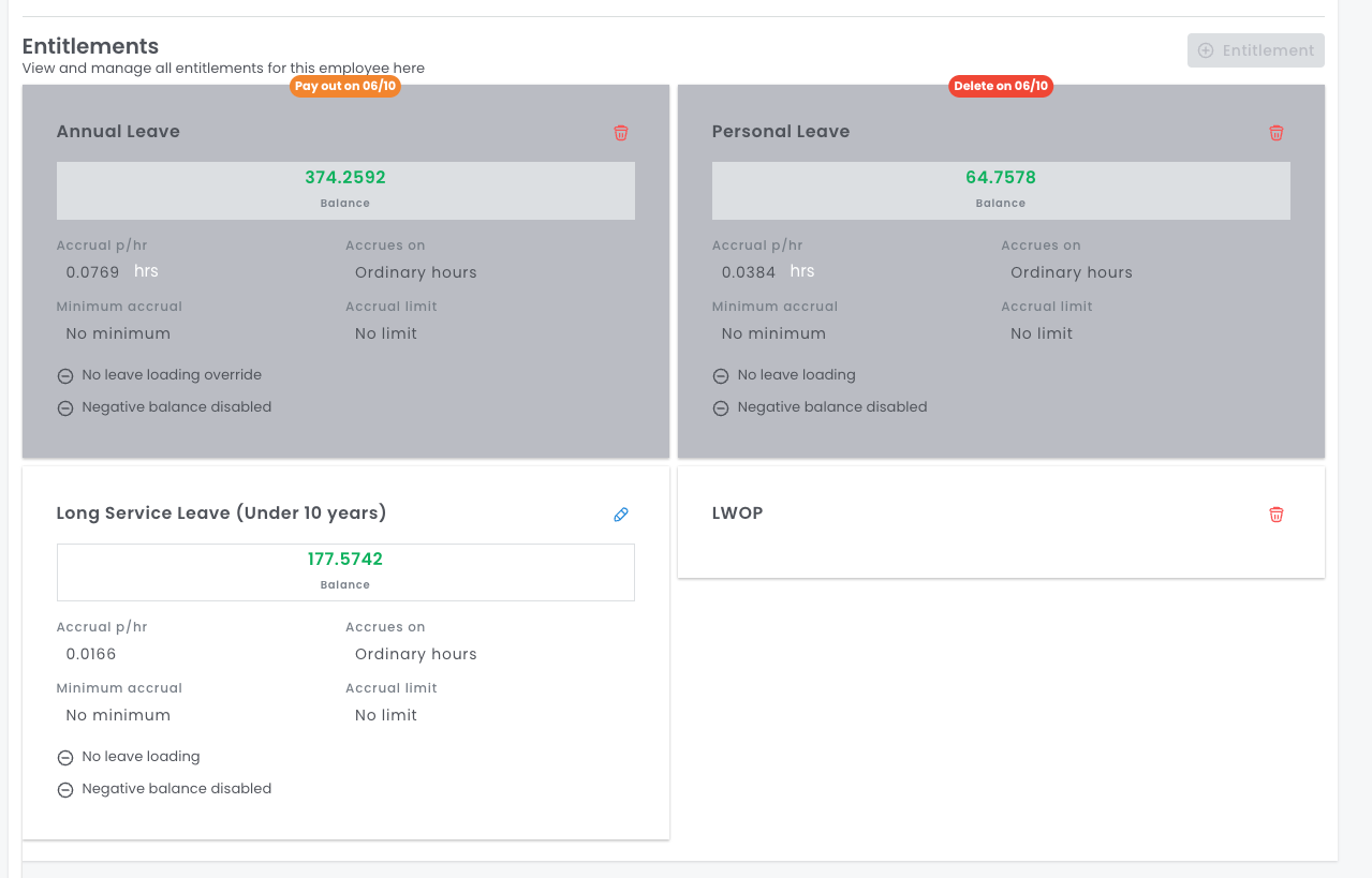 When you navigate back to the Employee Card > Employment Type and scroll down to the Entitlements area, you will notice the orange 'Pay Out' badge and 'Delete' badge over the entitlements chosen to be paid out or deleted.