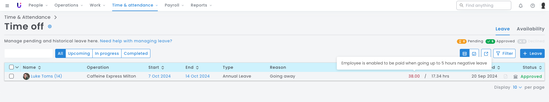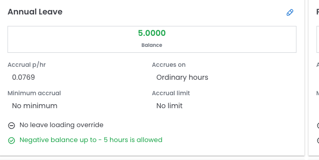 The negative balance on the entitlement overview will now be shown in green, and the negative capped amount will be displayed for this employee.