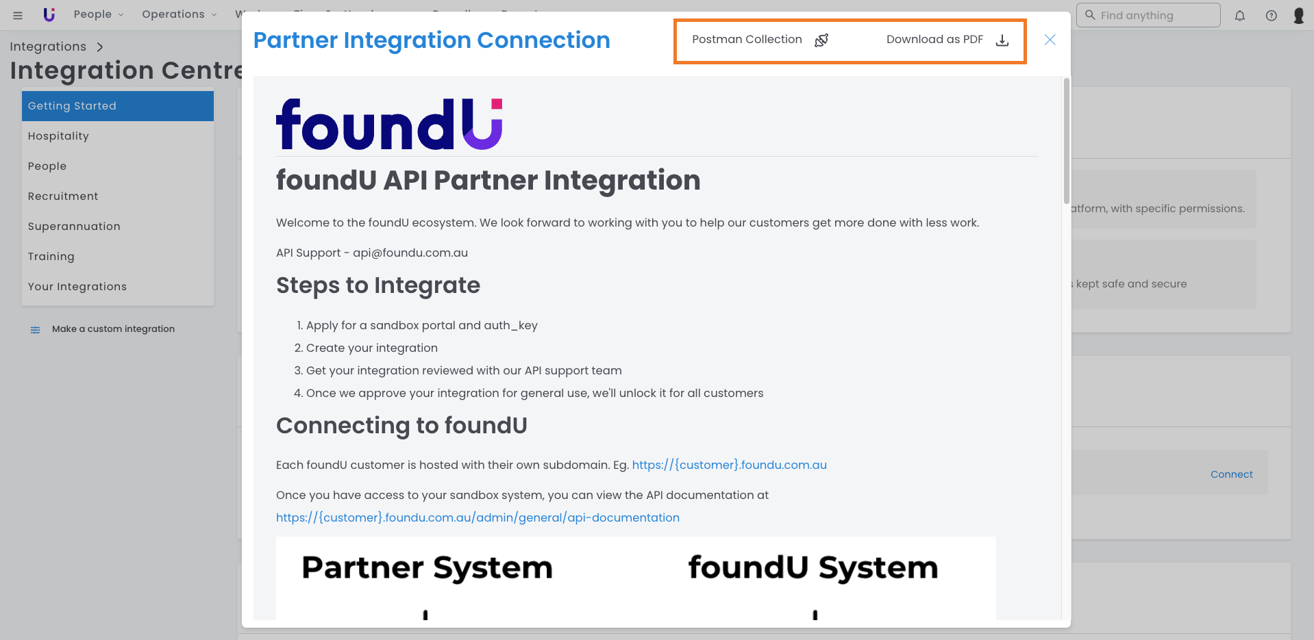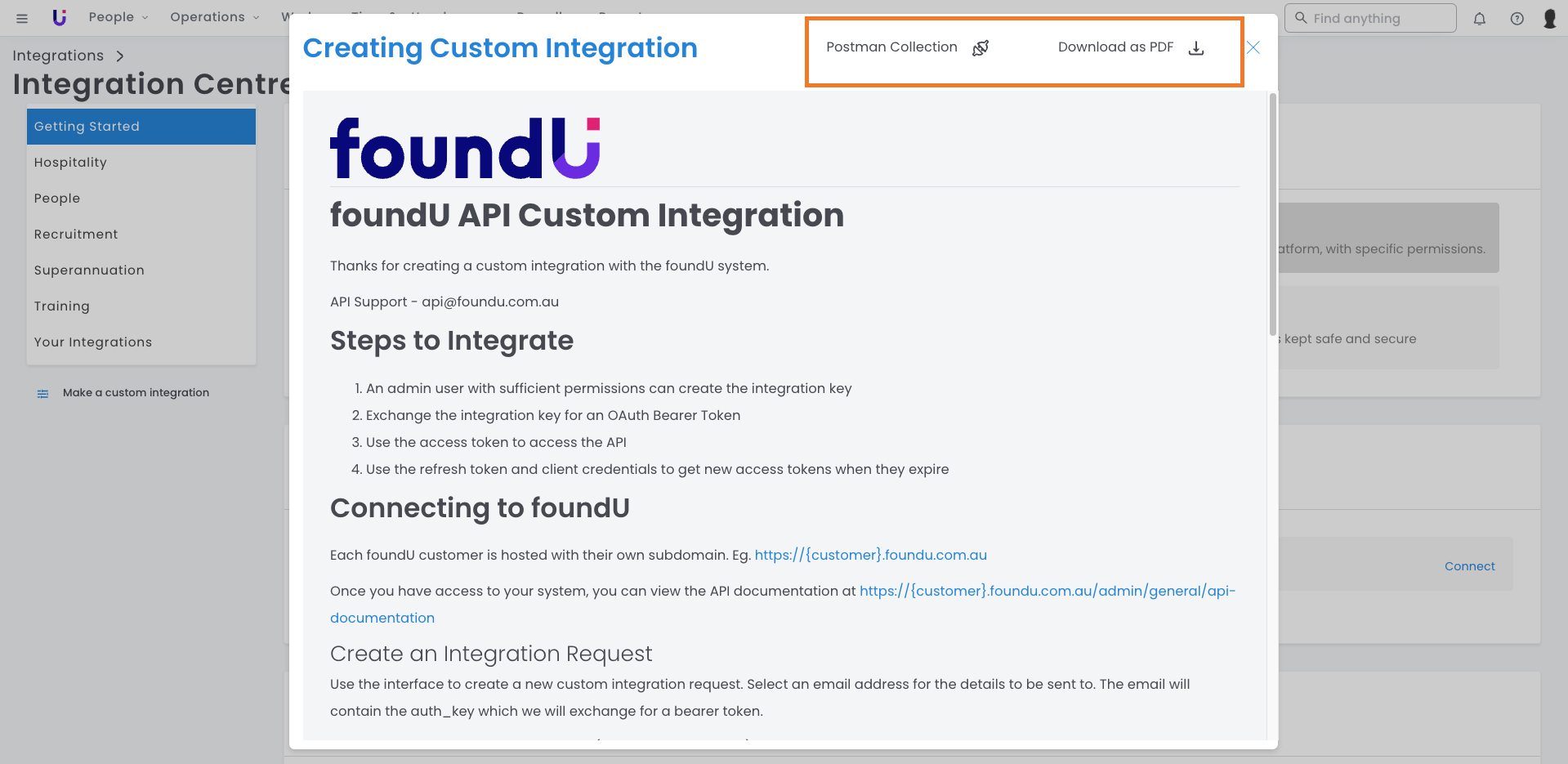 Give your developer access to the API documentation via the Integration Centre within your foundU platform. API support is also available upon request.