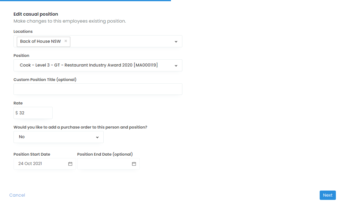 Many of your casual employees will likely experience changes in their positions during their tenure with you. This could range from adding more locations, allowing them to work across different rosters, to changing pay levels due to age or promotion. Any updates to your casual positions are easily handled through their Employee Profile.