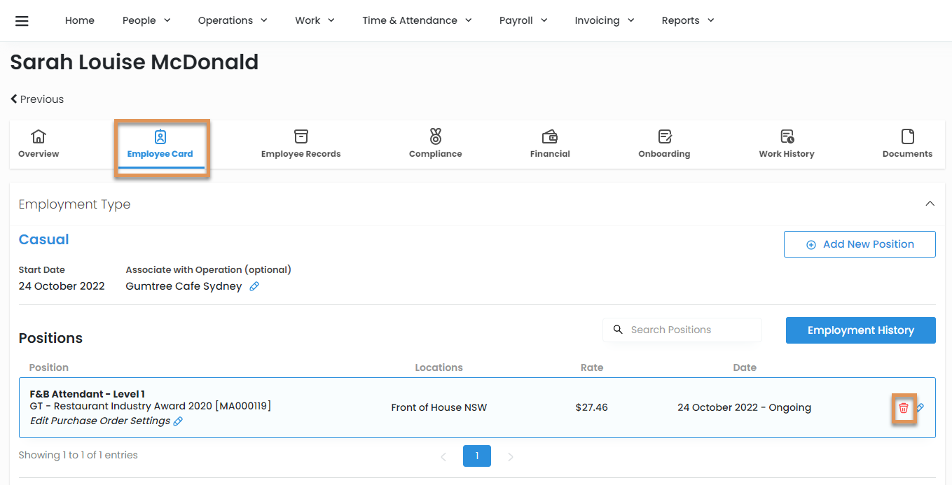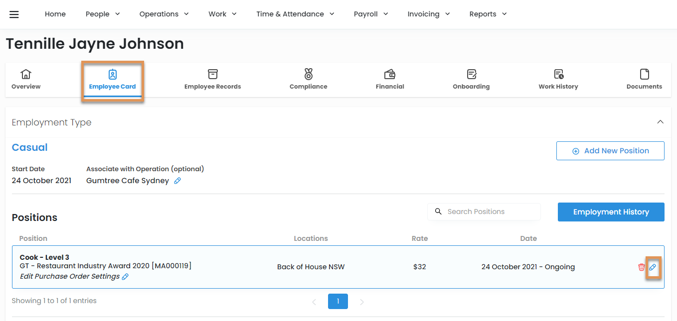 Sometimes, you may need to edit an employee's existing position/s. This could be due to a mistake in their pay rate, cost code, or an update or addition of locations.