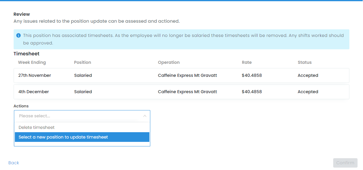 • Select a new position to update timesheet - The selected position will replace the existing one for the unprocessed timesheets. The selected position details, including the rate of pay, will be used.