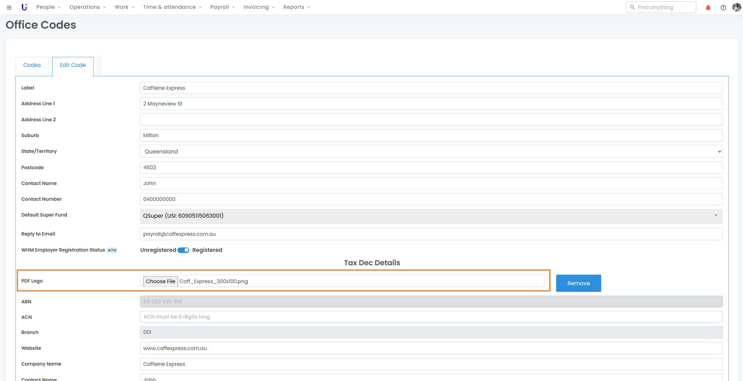 PDF logo - This logo appears on all PDF exports generated by the platform, such as reports and payslips. Unless you specify otherwise by using the office code, this logo will be the default image shown on these documents.