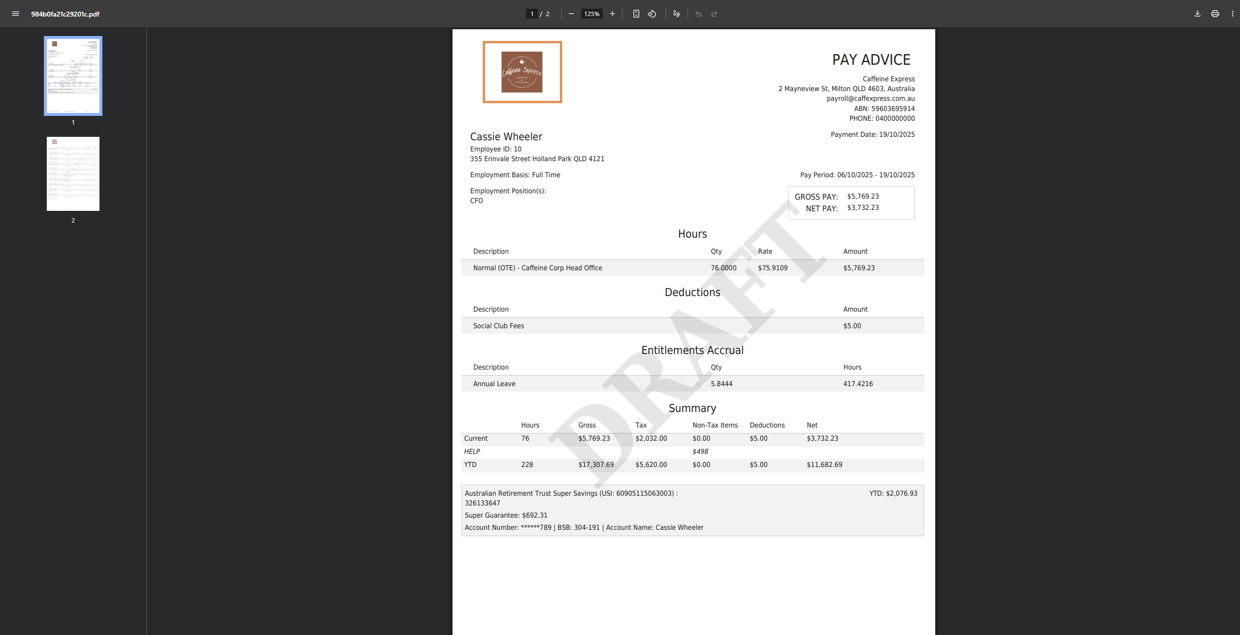 - To ensure the logo has been saved properly, navigate to Payroll > Pay, then choose a draft payslip to view. You will need to reprocess any draft payslips to include the new logo.