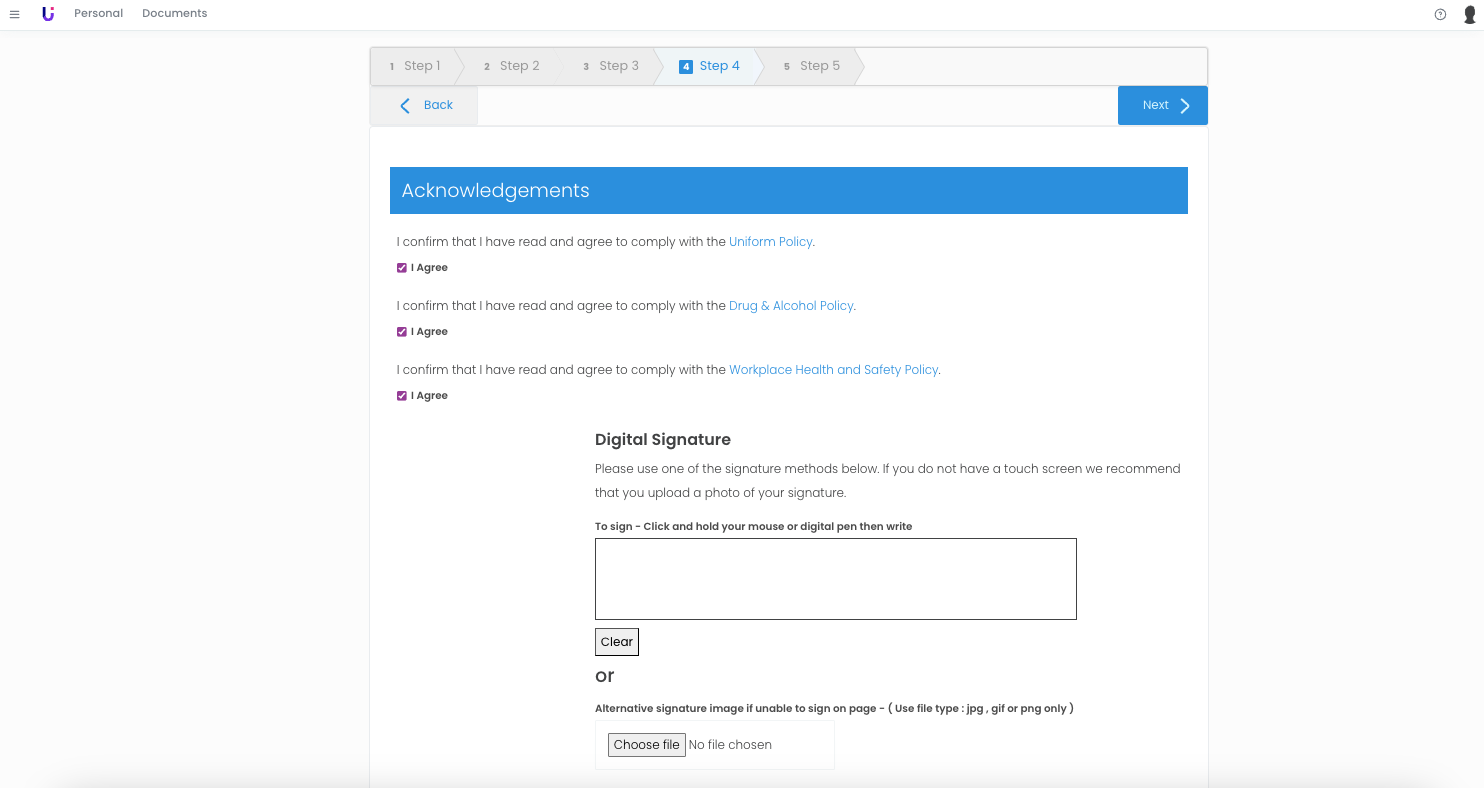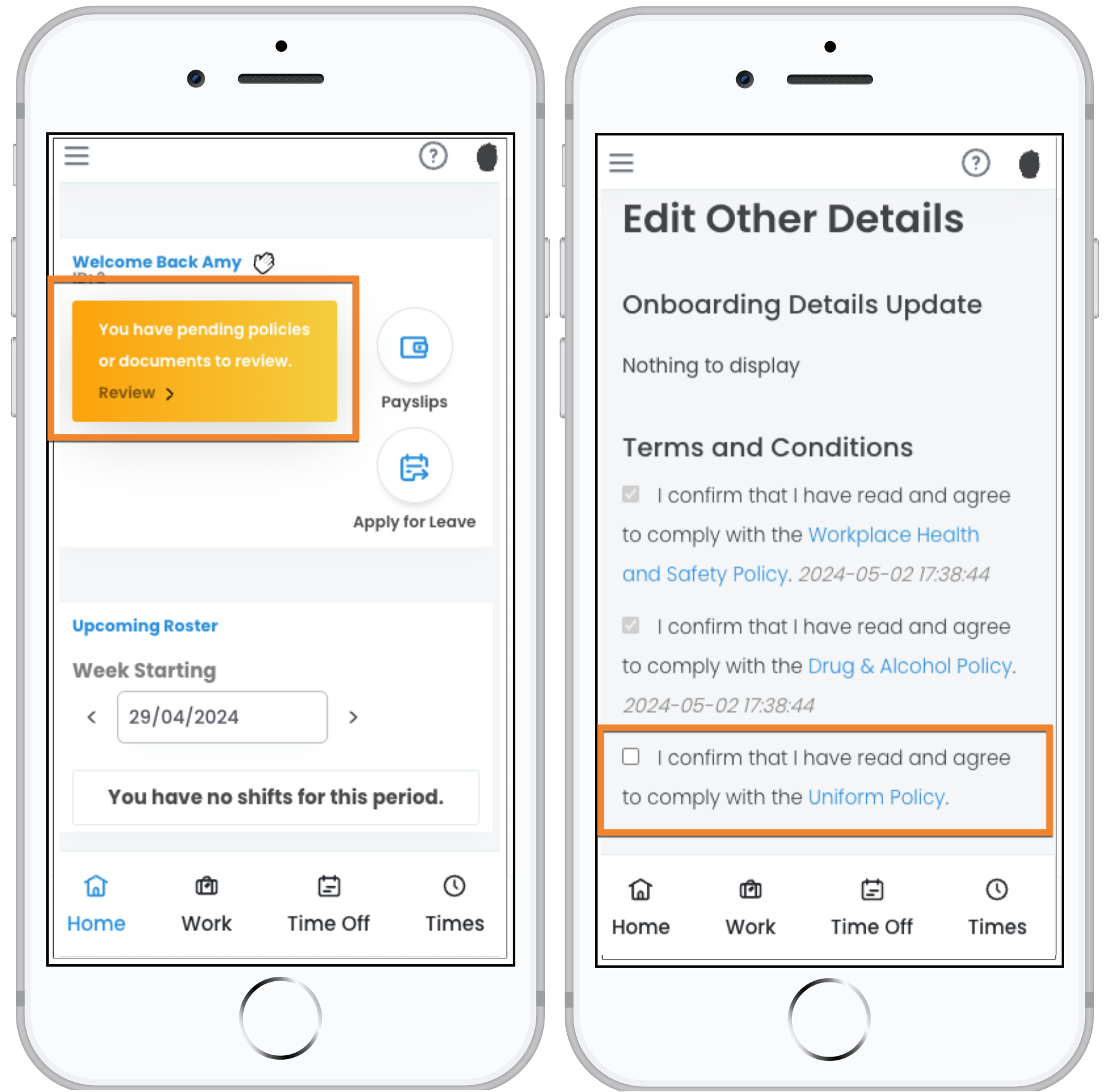 This allows new employees to agree to your policies during onboarding, or your current workforce when any new T&Cs are introduced.