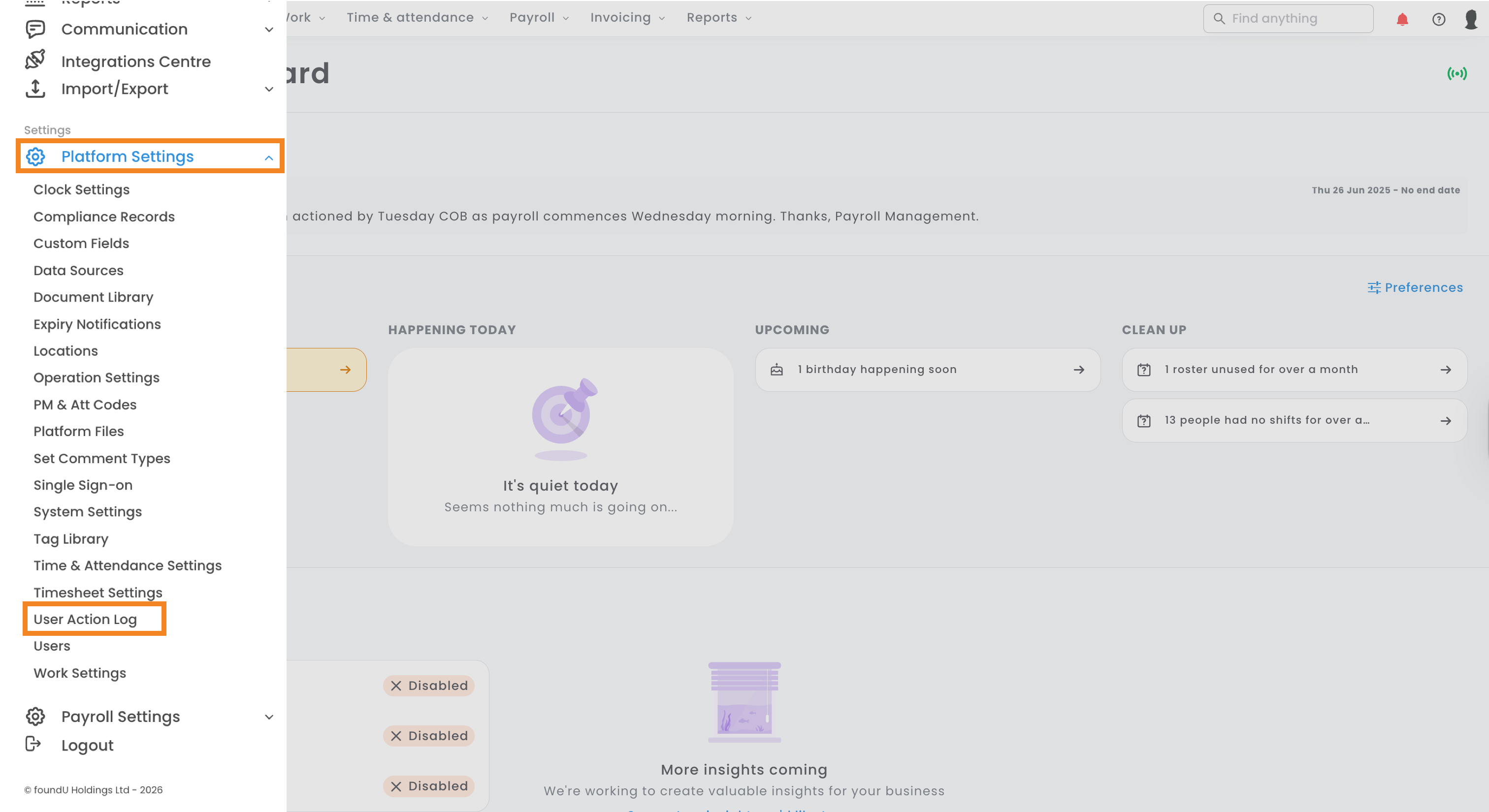 Contact us: For any major platform issues or further information on actions taken on your platform that are not visible in the User Action Log, you can reach out to our Support Team via email at help@foundu.com.au for assistance.