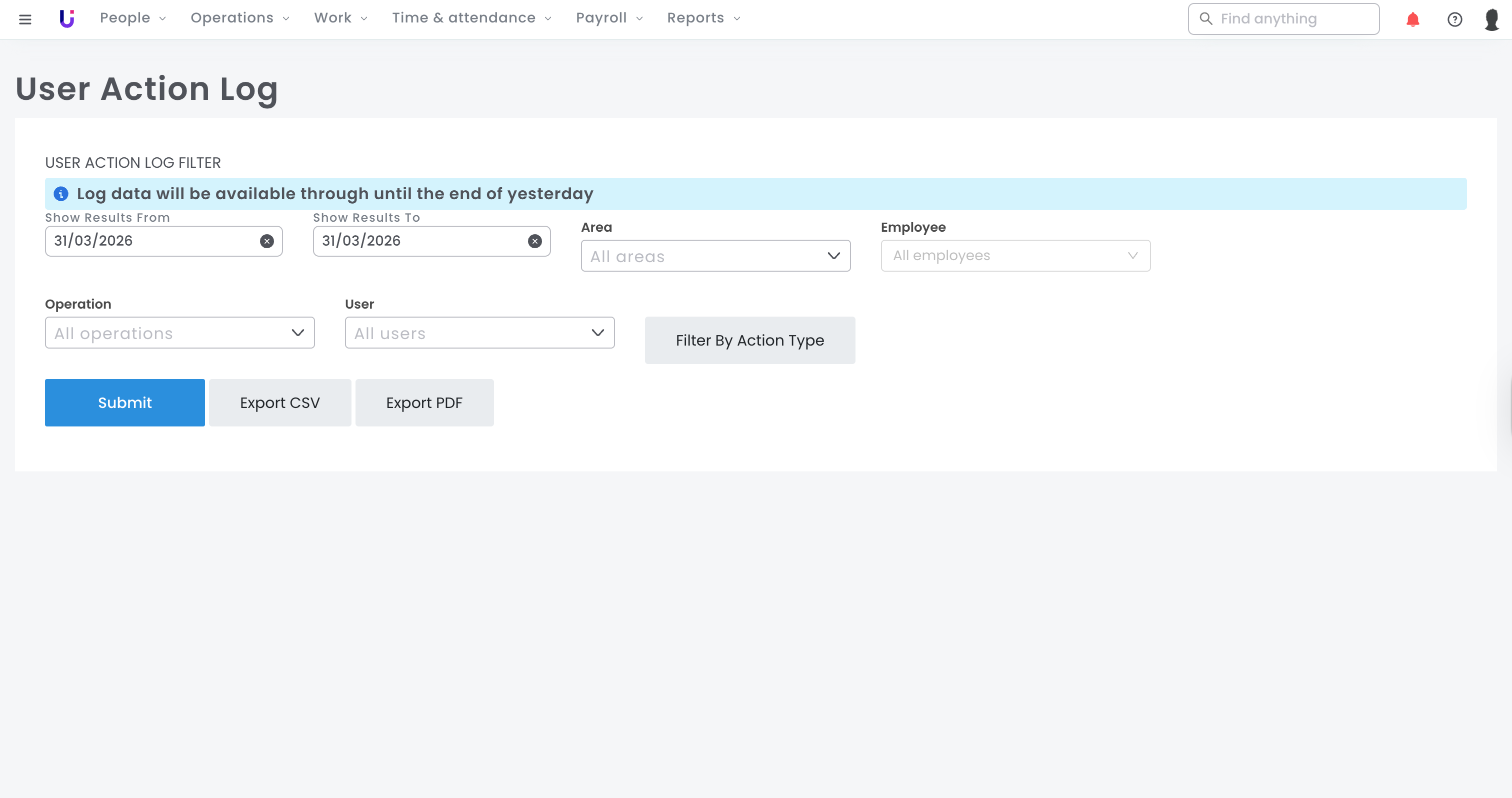 Please note: The User Action Log updates daily, so you can only view items captured up to the day before.