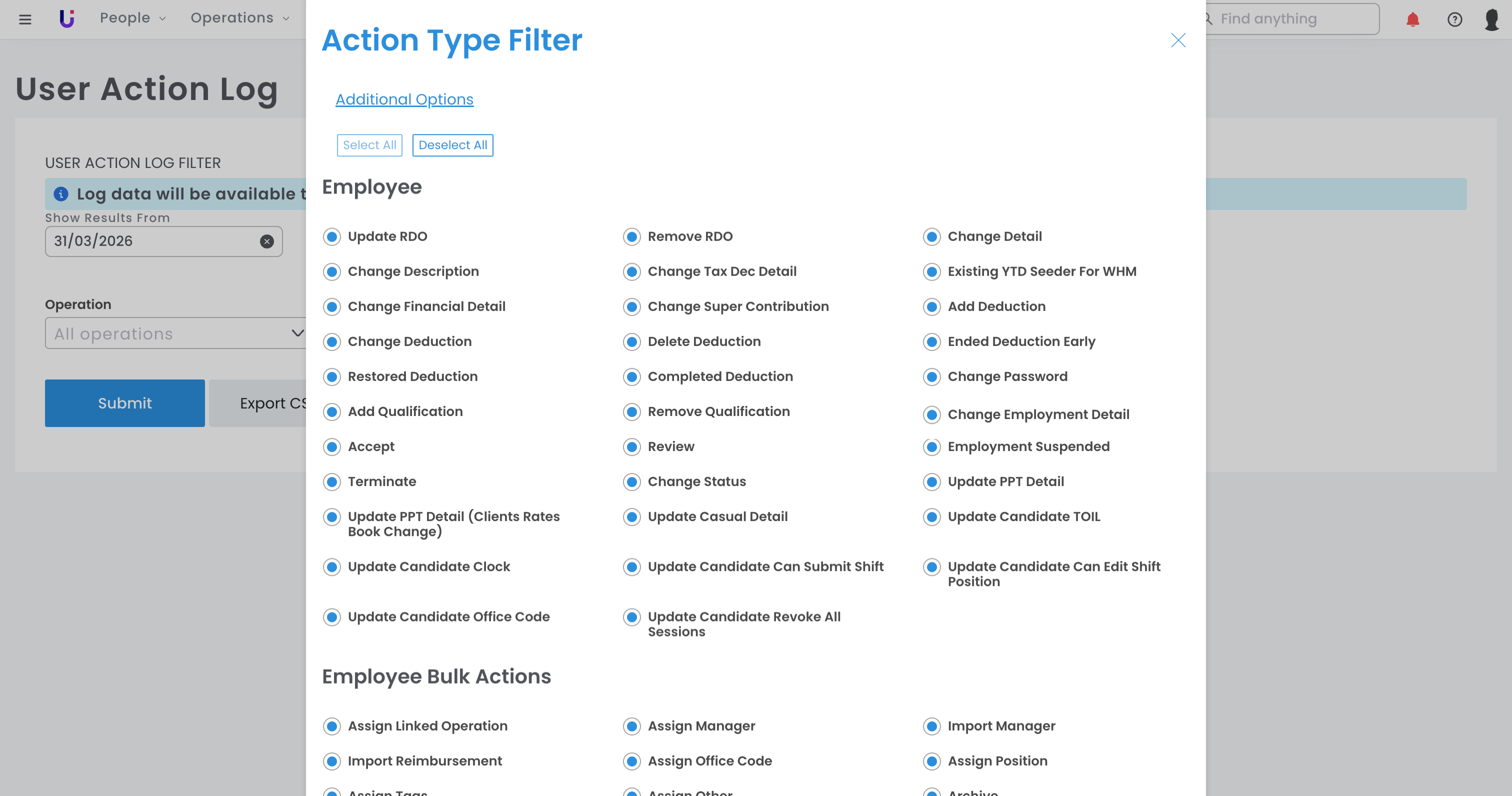 4. Additionally, you can Filter by Action Type, allowing you to select individual or multiple actions to filter and show.