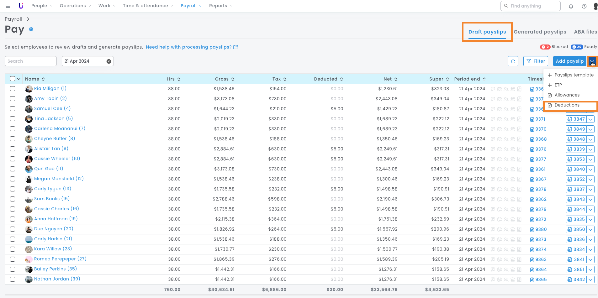 - If you haven't already done so, navigate to Payroll > Pay > Draft Payslips. Select the arrow next to Add payslip > select Deductions.