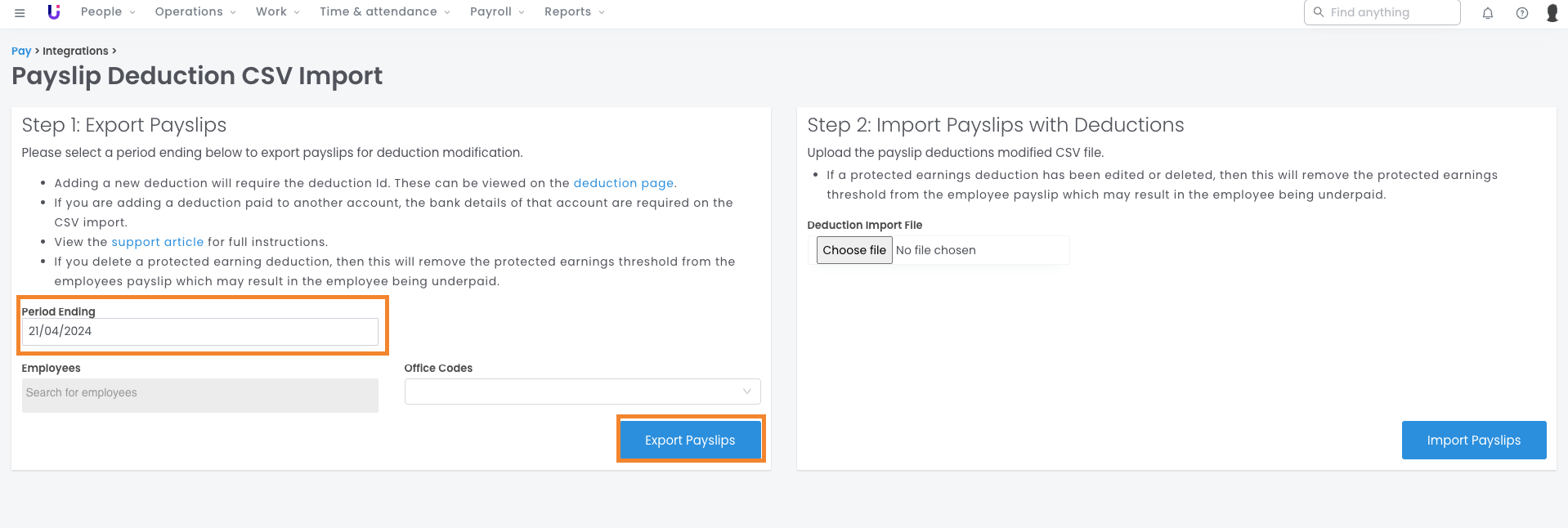 - Exporting your deductions for the current pay cycle, managing them and re-importing them.