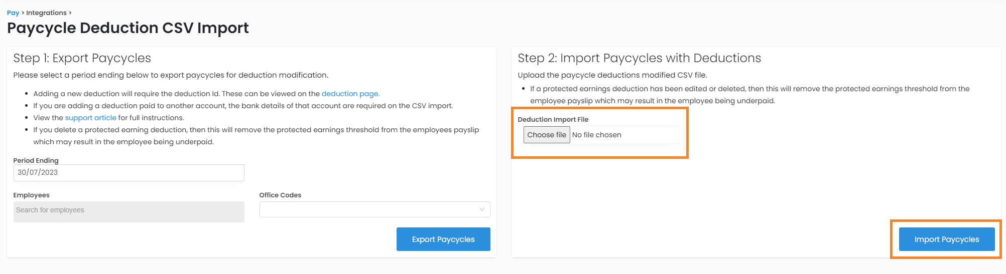 - On the right, in Step 2, navigate to Choose file, select your file with the changes and select Import Paycycles.