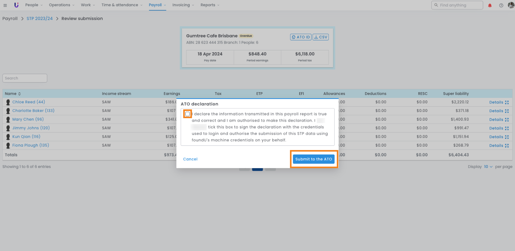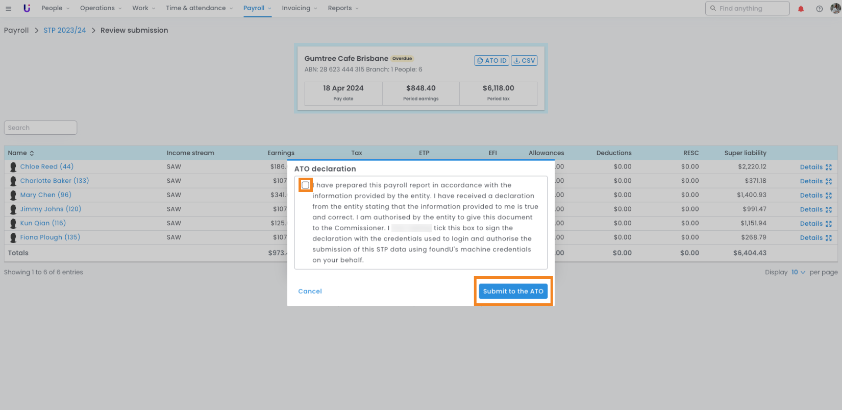 - Once you have reviewed the data in the STP submission, tick the declaration and 'Submit to ATO'.