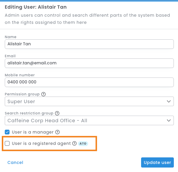 To do this, you will need to first ensure that your admin user is set up correctly by selecting the checkbox 'User is a registered agent' when creating or editing their admin profile.