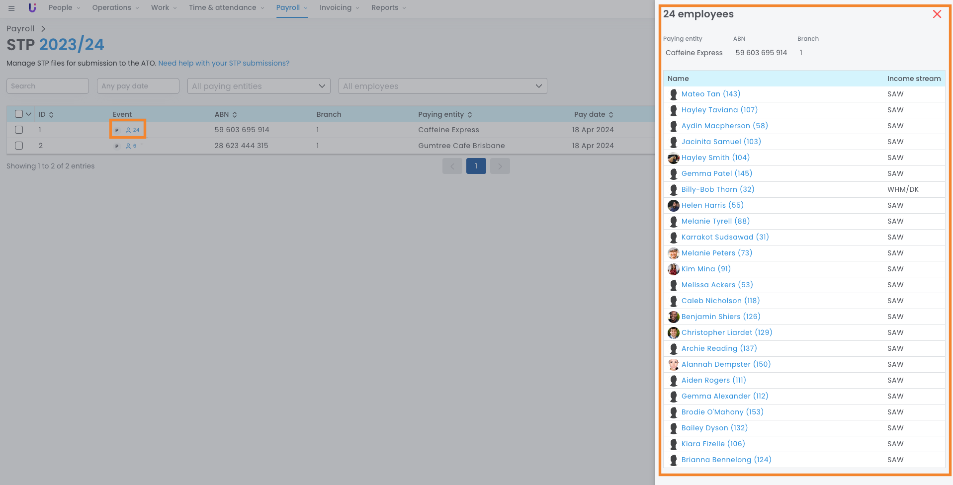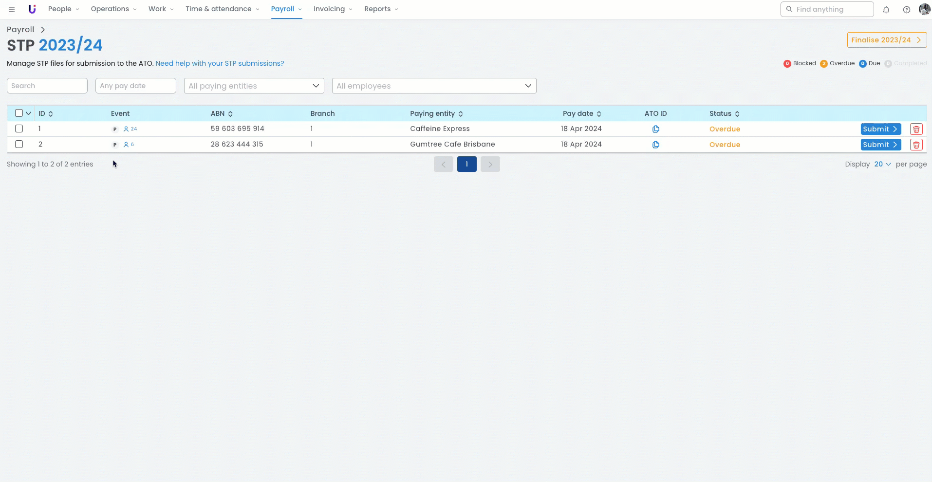 - Filter by pay date, paying entity or employee to locate the complete STP submission you're after.