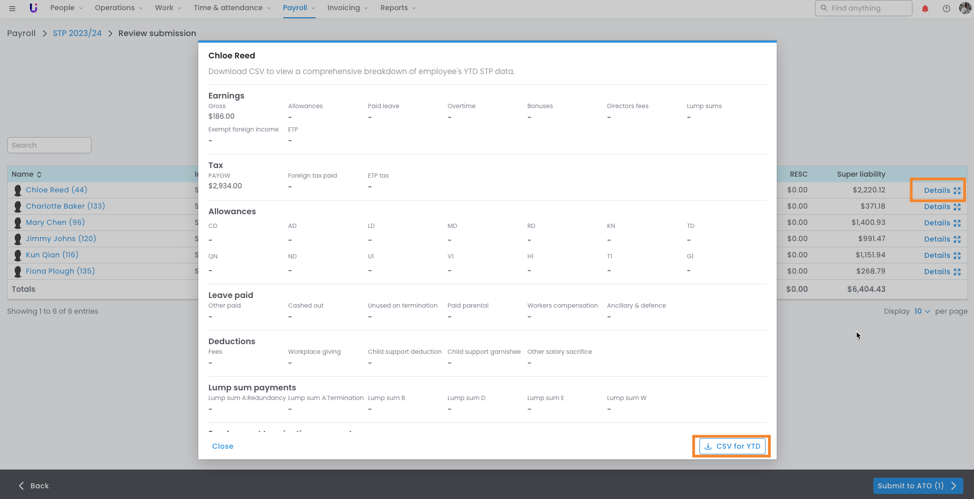 Watch the below gif to see how to submit an STP submission. You'll also see how to view the details of that STP submission (per employee) using the 'Details' option, or how to download all employee YTD data to CSV if you choose.