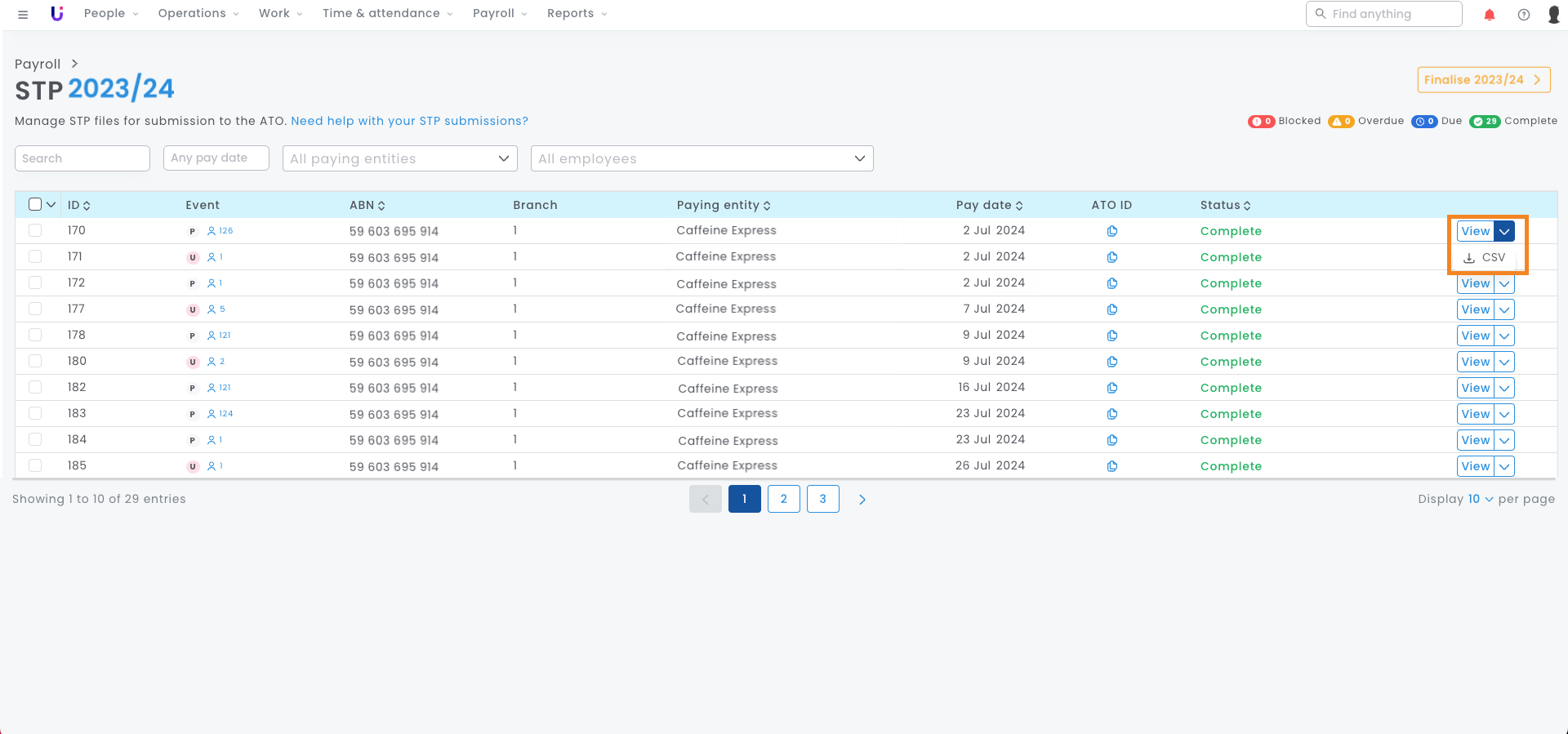Tip: Here you can export your submitted/complete STP submissions to a CSV file or filter to the relevant employee or Paying entity to help with STP reconciliation.