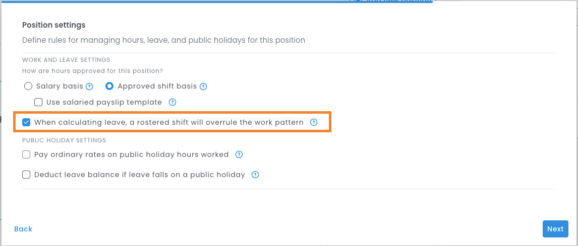 When setting up positions for your permanent employees, there are 2 settings you can review that impact how leave can be applied. The setting we are looking at is the 'When calculating, leave, a rostered shift will overrule the work pattern'.
