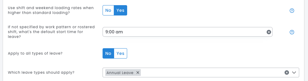 - Saturday - Saturday loading. Based on the work pattern day & 9:00 am as the default time in the award settings.