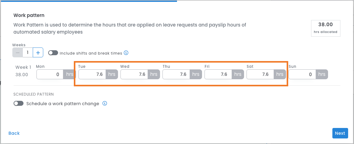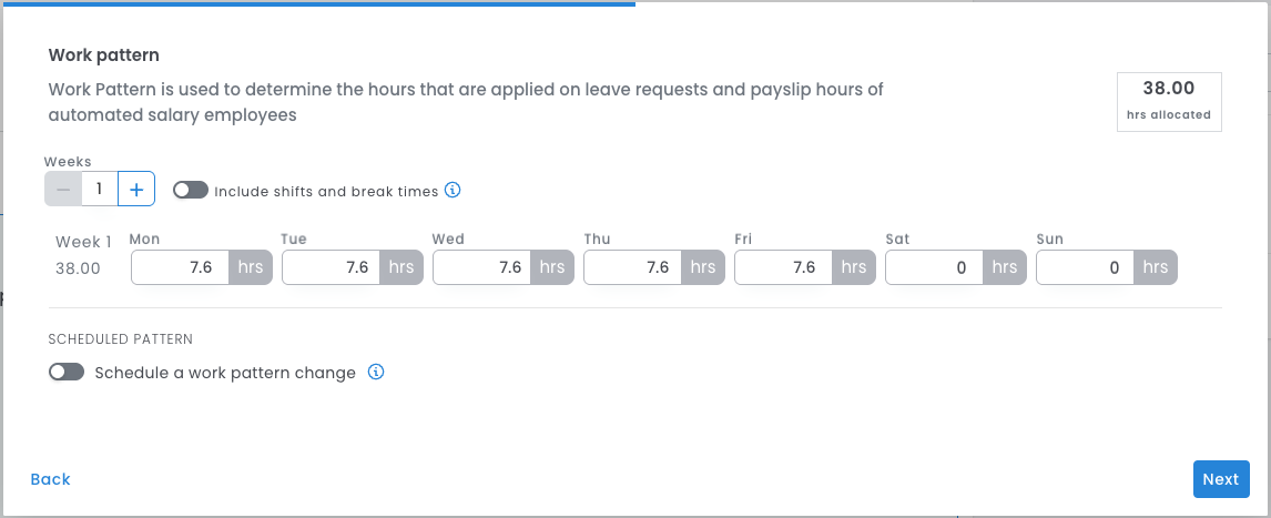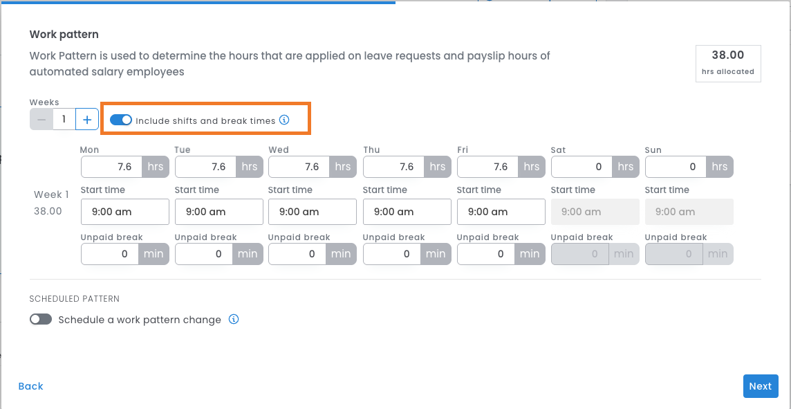 - Additionally, you have the option to set the shift times and an unpaid break in the work pattern.