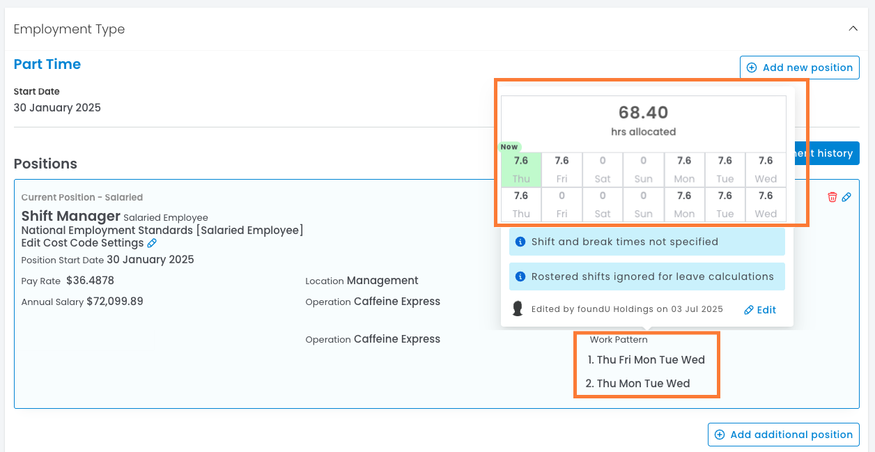 All permanent employees will have a work pattern configured as a part of their primary position setup. The work pattern is where you specify the number of hours the employee works each day. You can also optionally set the shift times in the work pattern.