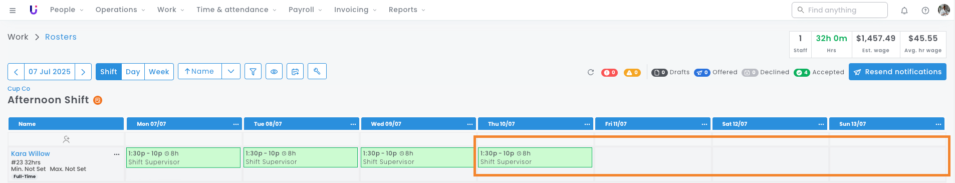 - Kara is rostered for 8 hours on Thursday but has no shift on Friday, Saturday, or Sunday.