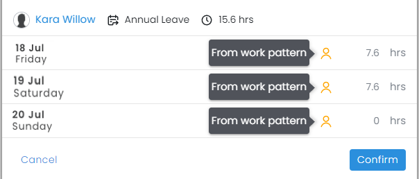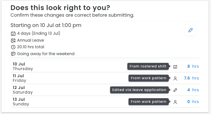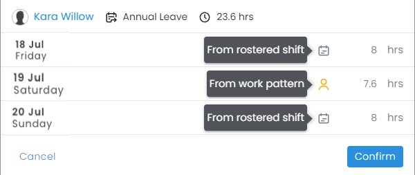 Please note: If an employee does not have a rostered shift when submitting leave (e.g., a future leave application), the work pattern's hours will be used as the default.