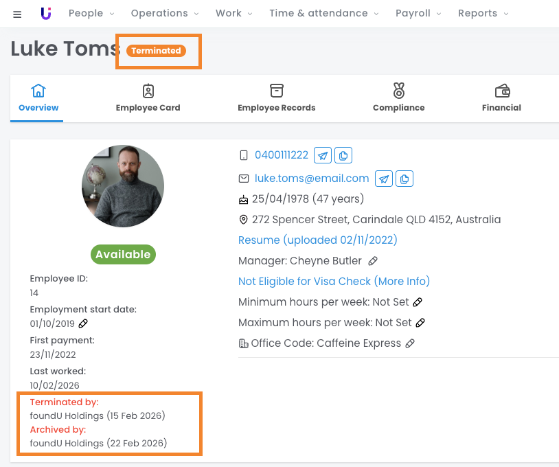 In the example below, you can see that Luke is both Terminated and Archived. He was terminated by foundU Holdings on 15th February and was archived the next week after the payroll.