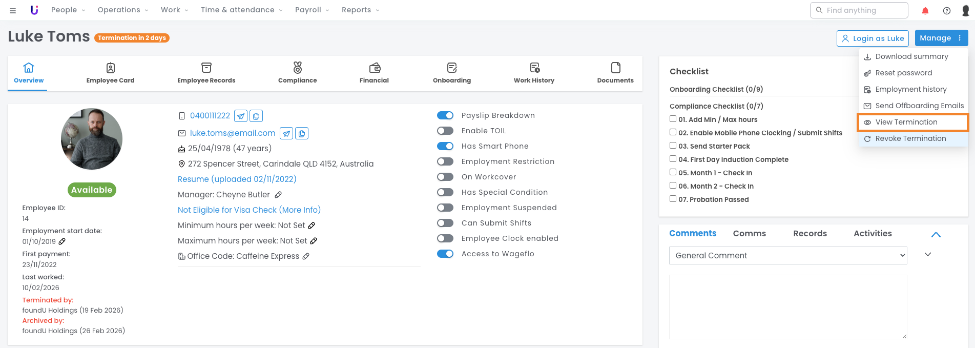 When an employee leaves your business, the first step is to terminate their profile using the Termination workflow. This workflow streamlines the offboarding process by automating key processes and ensuring all required details are captured in one place, including: