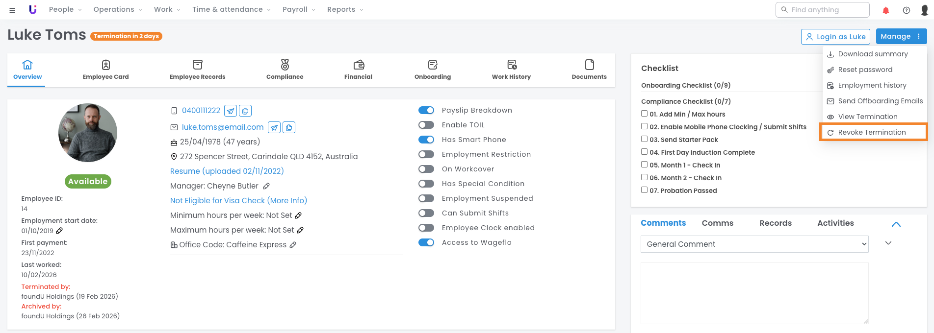 If you would like to proceed, select Confirm and Revoke. This will delete the termination and archive dates and remove any previously entered details. If leave entitlements were to be paid out, this will be cancelled.