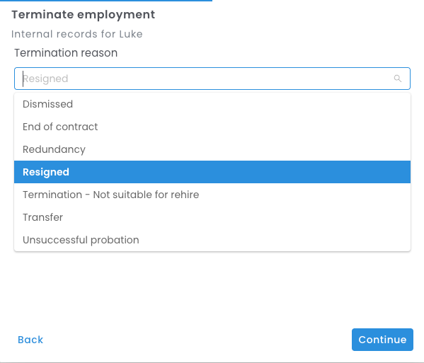 Hot tip: The best practice is to initiate termination as soon as you’re informed. You can set the termination for a future date if needed; employees can continue to be rostered and work as usual until that date.
