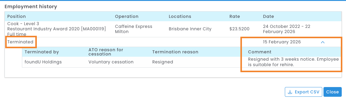 The Employment history will also show a record of the Termination details, including the reason reported to the ATO, and any internal comments left by the admin who actioned the termination. This may be helpful if you are considering rehiring an employee in the future.
