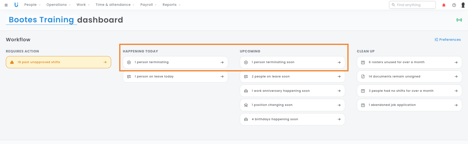 You can also filter for terminated employees from the Approve People menu, or by selecting the 'Terminating soon', 'Terminating today' cards from the Dashboard.
