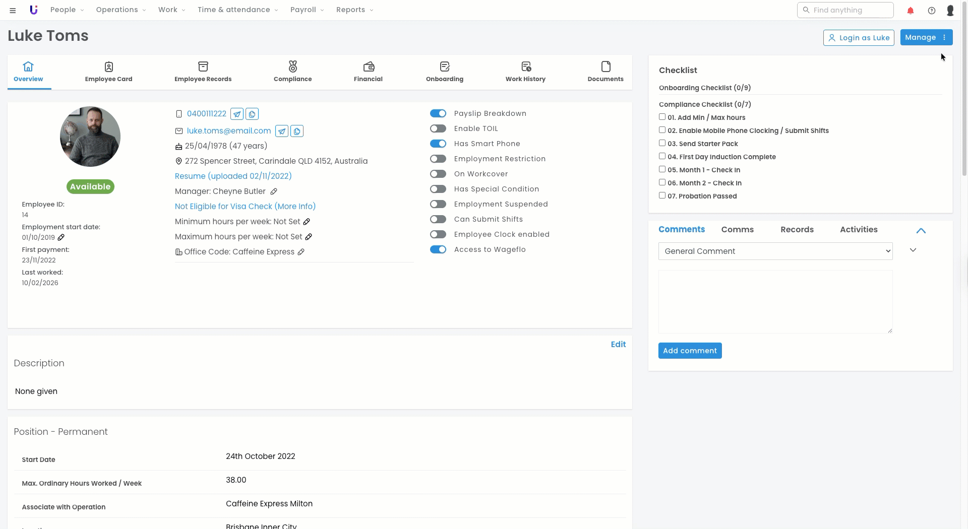 Compliance Checklist – Every employee profile includes two checklists: the Onboarding Checklist and the Compliance Checklist. Both are fully customisable, with the same checklists appearing on every employee profile.