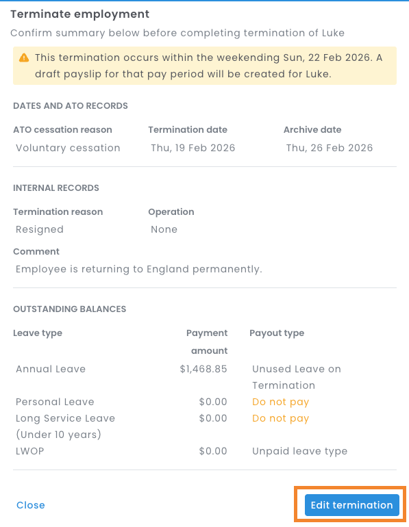 Select Edit termination to make changes. You will be taken through the steps from the beginning, allowing you to make your amendments where necessary.