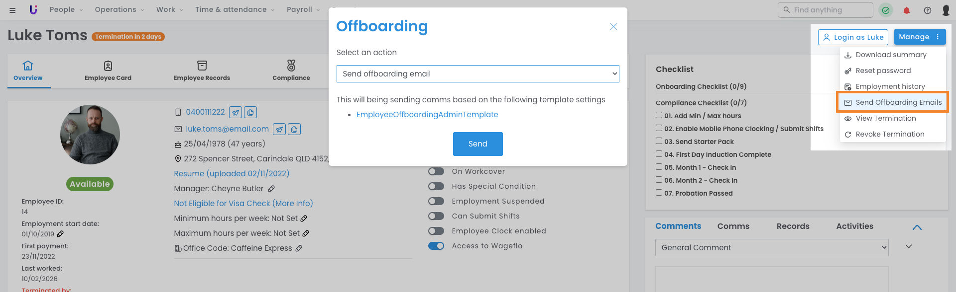 Offboarding email – Send a dynamic offboarding email via Manage > Send Offboarding email to notify other admin users involved in the process.
