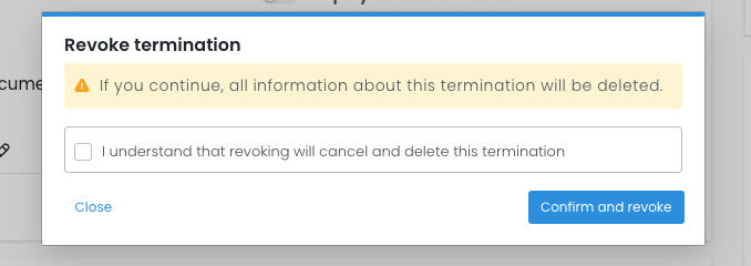 If you would like to proceed, mark the checkbox to confirm you understand that this will delete the termination. Then select Confirm and Revoke.