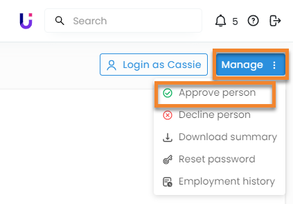 To Approve an employee select Manage > Approve person.