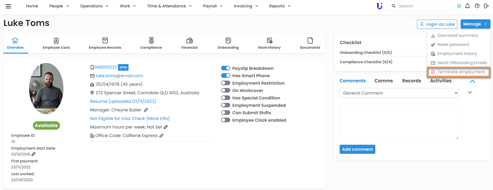 The Employment history will also show a record of the Termination details, including reason, comment, and operation. This may be helpful if you are considering rehiring an employee in the future.